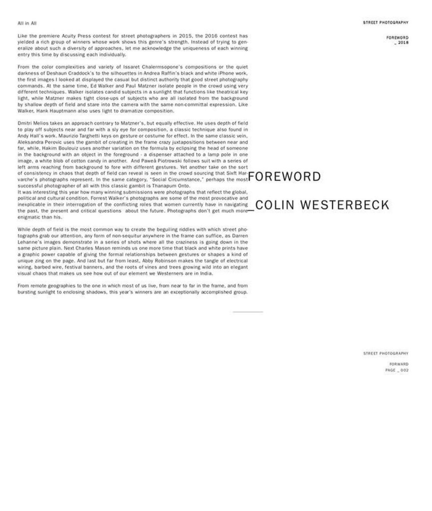 However, that’s where the excitement ended and frustration took hold. A year went by and no book was published. Then another year went by and still nothing. Eventually some of the winning finalists (some seriously talented and well known street photographers amongst us) got together online and put pressure on Acuity Press to offer some kind of update.