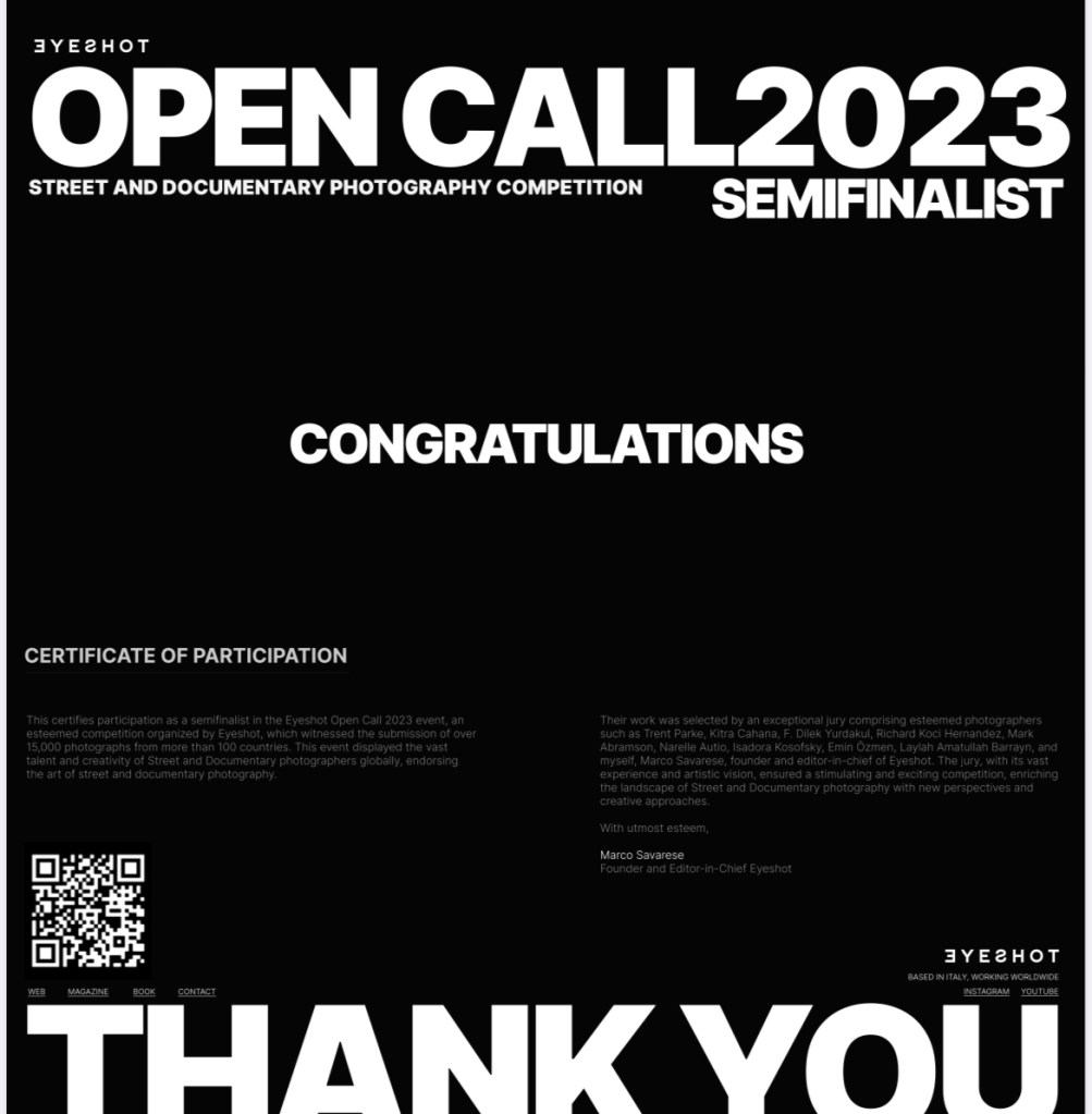 Whilst I didn’t quite make it through to the final of the esteemed Eyeshot Magazine Open Call 2023, based around the theme of the human being, I am thrilled to have been an official semi-finalist.