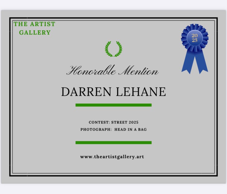 I’m delighted to announce I received an Honourable Mention in the recent Artists Gallery Street Photography Awards 2025, for my ‘Head In A Bag’ photo. It was captured in Bristol in July 2024.