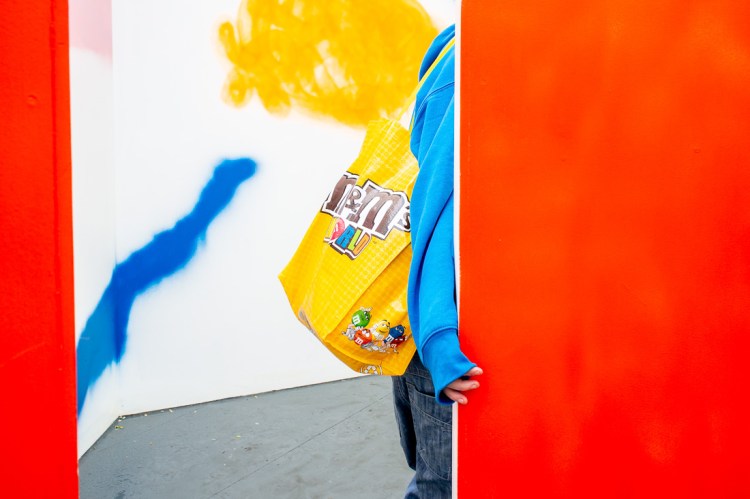 You couldn’t stage this better if you tried. The red, yellow and blue form a bold visual triad – art school 101 – but here it’s accidental brilliance. From the pop-art palette of the M&M bag to the blue hoodie and that streak of spray-paint on the back wall, it’s as if the whole scene conspired to become a Mondrian on acid.
